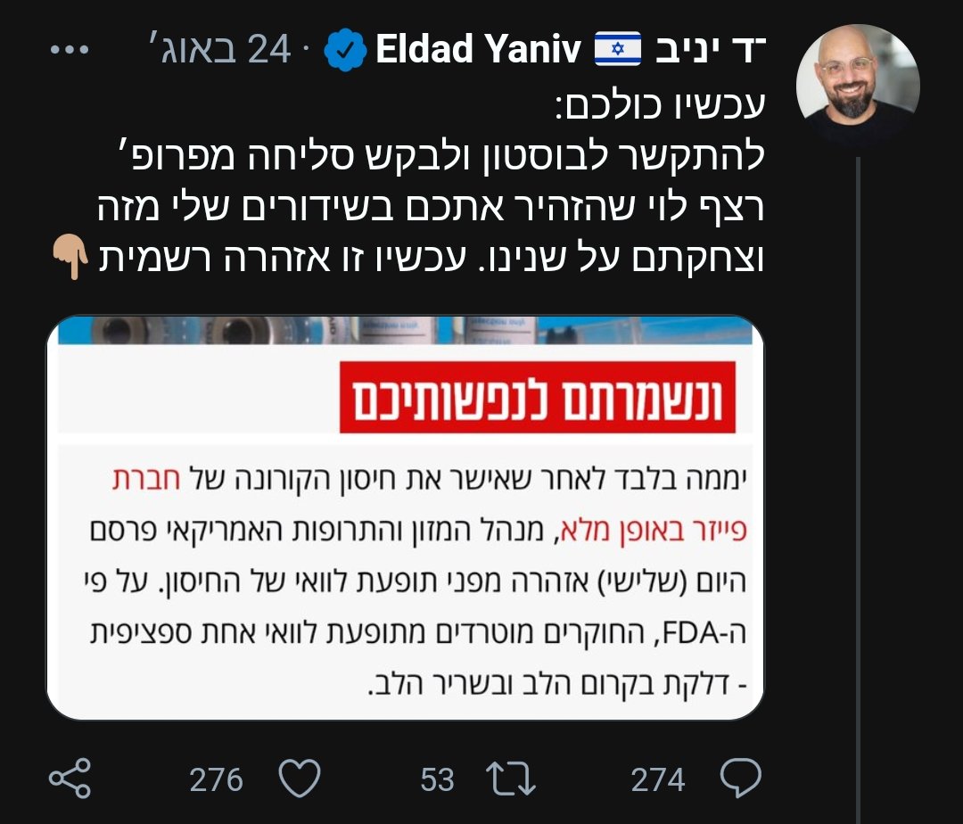 לשיטת יניב, עולם הרפואה ישב בחיבוק ידיים והתעלם מהפגיעות הלבביות של החיסון, עד שבא רצף לוי עם המחקר שלו, פירסם אותו אצל אלדד יניב ובפייסבוק של מח"צ קורונה, ועכשיו ה-FDA השתכנע שזה נכון וכולם צריכים להתנצל. זהו בולשיט בריבוע.