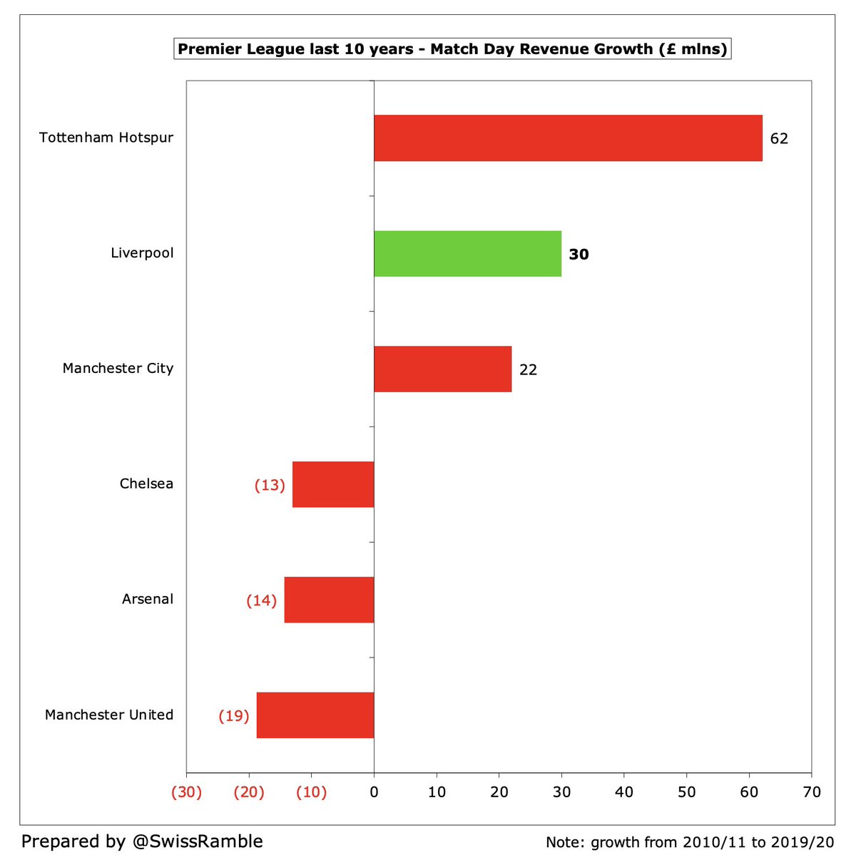 #LFC match day revenue has grown £30m (73%) in last 10 years from £41m to £71m, mainly due to expansion of Anfield’s Main Stand. Would have been higher without some games played behind closed doors in 2020. Growth only below #THFC (new stadium), but still just 4th highest in PL.