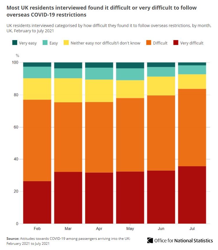 Most UK residents arriving in the UK found following overseas #COVID19 restrictions either difficult, or very difficult (84% in July 2021).