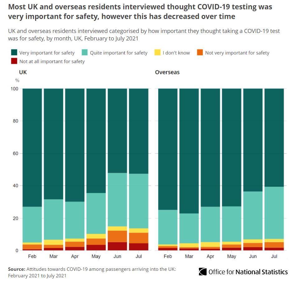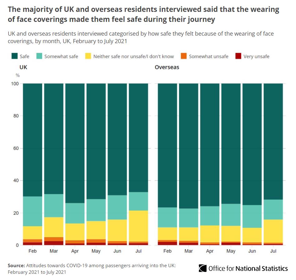 More than two thirds of both UK and overseas residents arriving in the UK in July 2021 said the wearing of face coverings made them feel safe during their journey ow.ly/VlYZ50G4JB6