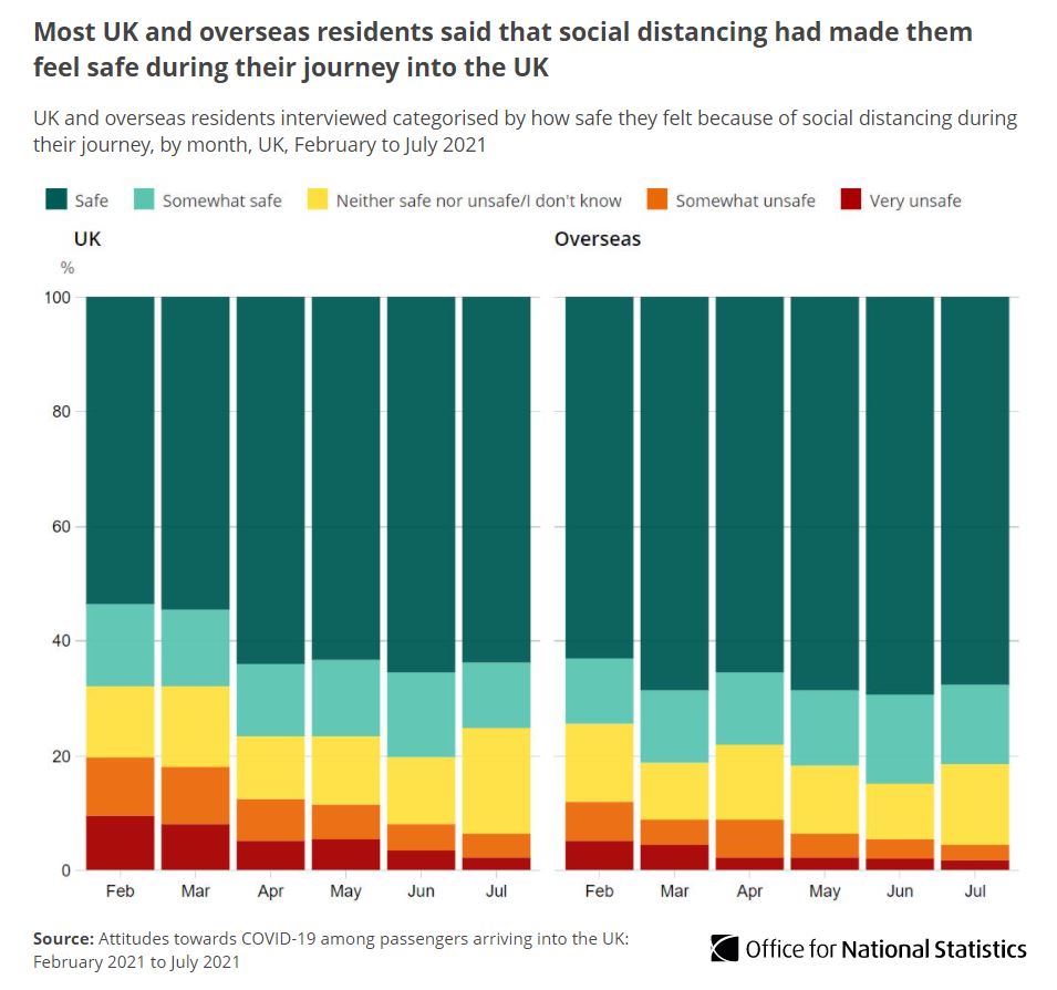 Roughly two thirds of all UK (64%) and overseas residents (68%) interviewed felt safe with social distancing during their journey in July 2021.