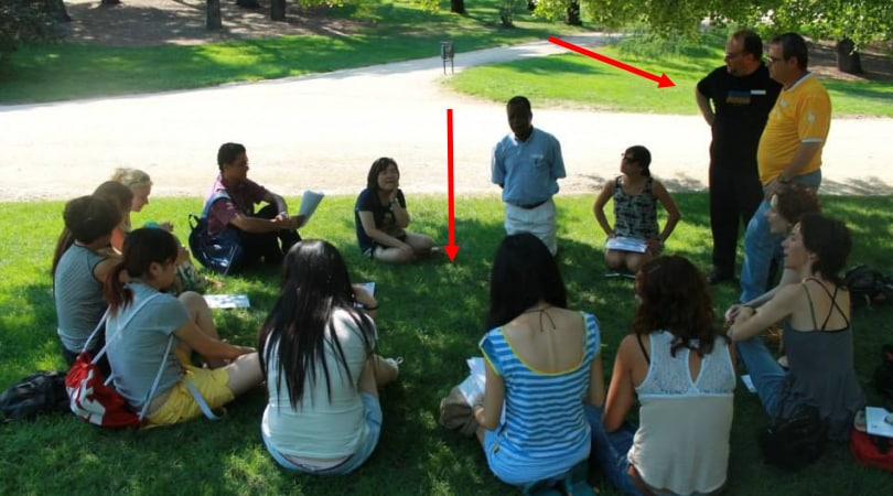 Aqui há uma imagem ilustrativa (uma reunião de conhecidos), mas fica evidente que, se todos se sentarem, os infiltrados ficarão expostos.