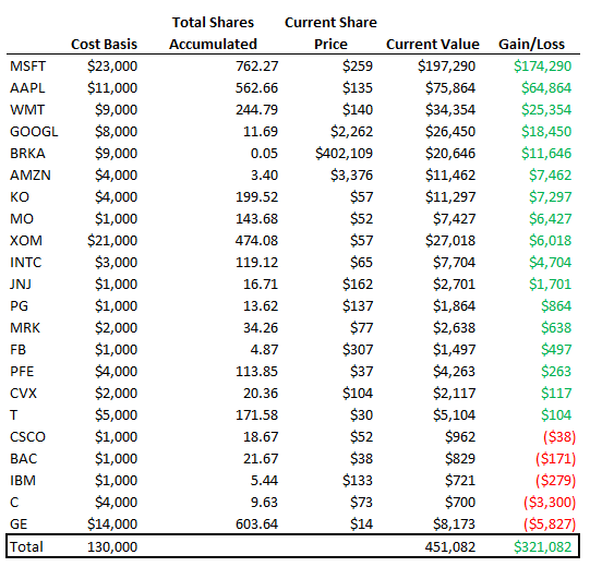 Let's say you bought the 5 largest stocks by market cap each year since 1995. You equal weight them and you invest in them on Day 1 of that year. For my experiment I just assumed I buy $1000 worth of each of the top 5, or $5000 total every year.