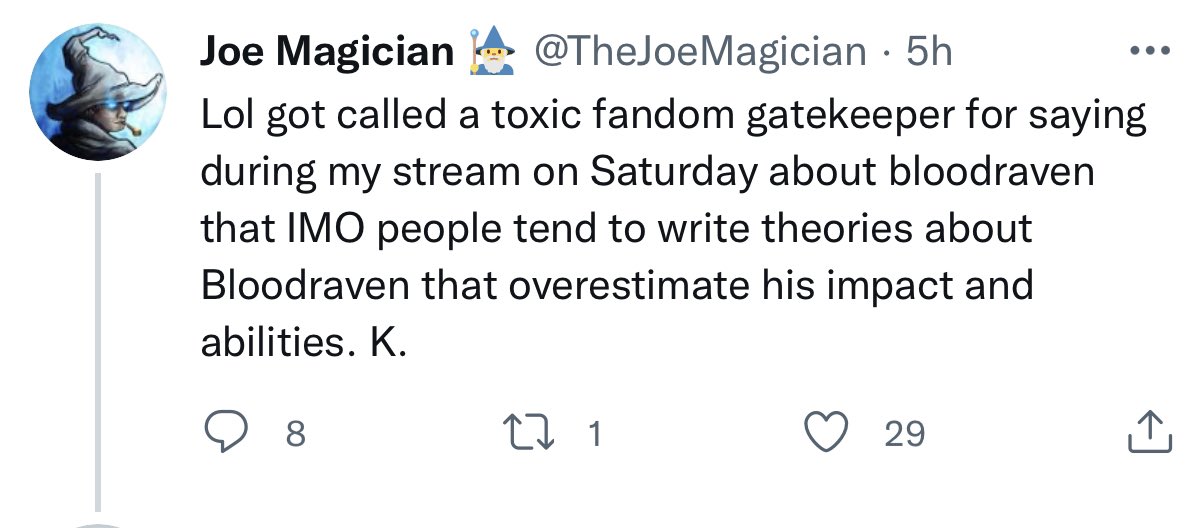 Joe is a toxic fandom gatekeeper because he very obnoxiously tried to use his power as a content creator to cancel me w/out ANY sort of firsthand knowledge of the events in question. He deletes threads mentioning my ideas from Reddit, where he’s a mod. He’s a jealous bitch