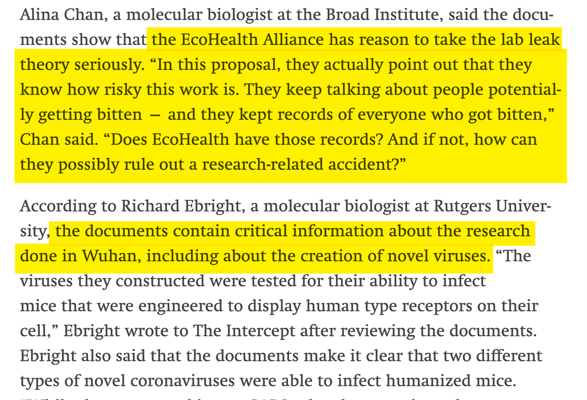 3/ Specifically, the documents the Intercept sought -- which I'll bet any amount of money they thought would debunk Paul & vindicate Fauci -- instead did the opposite (oops). The docs more than ever link Daszak's research to possible COVID origins.