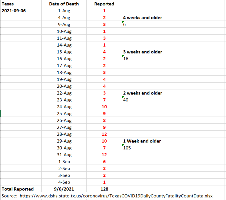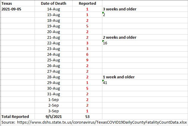 1) Testing definitely peaking last week 2) More Labor Day catch up on Cases 3) Hosps down vs yesterday & Last week. Should decline strongly this weekend 4) Fatality breakdown on 405 reported. Labor Day catch up