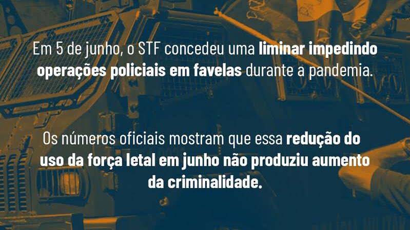Em 5 de junho, o ministro Edson Facchin, do STF, concedeu uma liminar, no processo conhecido como ADPF das Favelas pela Vida, que determinou a suspensão de operações policiais em favelas durante a pandemia, a não em circunstâncias especiais.