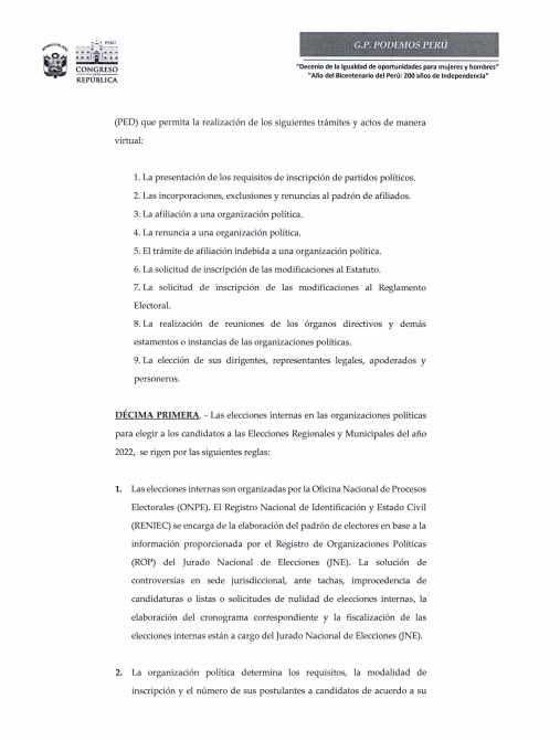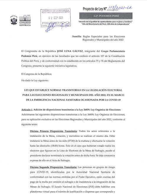 @JNE_Peru@ONPE_oficial@Eli_PradoD Viendo la agenda de la Comisión de Constitución, veo que esta no es la única iniciativa. También hay una de José Luna Gálvez, vocero y dueño de Podemos Perú. Esta propuesta también apunta a posponer las primarias y, para peor, continuar con la modalidad de delegados (4)