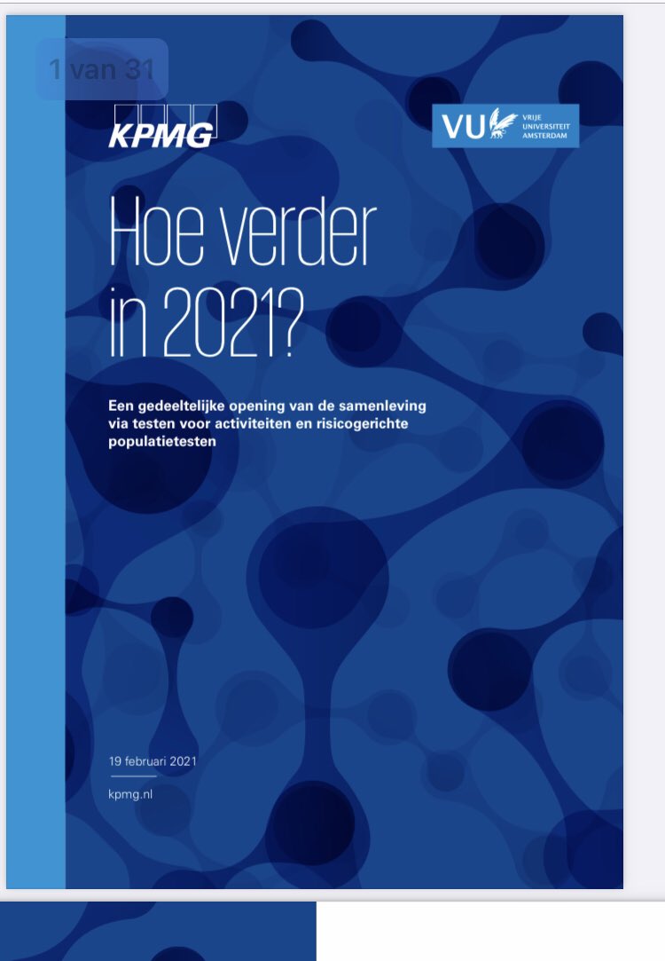 KPMG adviseerde samen met de VU in februari 2021 ook over populatietesten en testen voor activiteiten (meer vrijheden voor gevaccineerden dan niet-gevaccineerden, fieldlabs, vaccinatiepaspoort, 20 miljoen testen per maand etc.). 5/