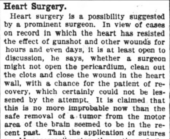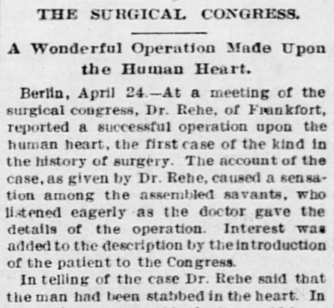 Rehn found a wound in the right ventricle, which he closed with three silk sutures - not easy, since the heart was still beating. "The heart continued to beat, and we could breathe freely," he wrote. The patient had a 'tendency to vomiting', but made a full recovery.