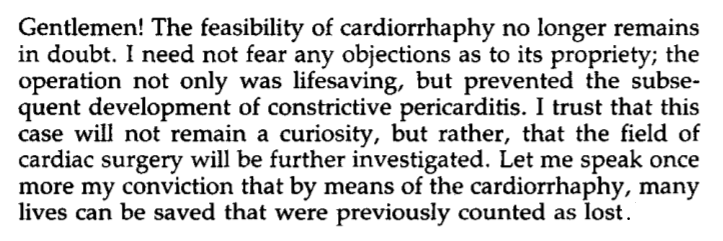 Rehn concluded his original case report by expressing the hope that 'this case will not remain a curiosity, but, rather, that the field of cardiac surgery will be further investigated.' He certainly got his wish!