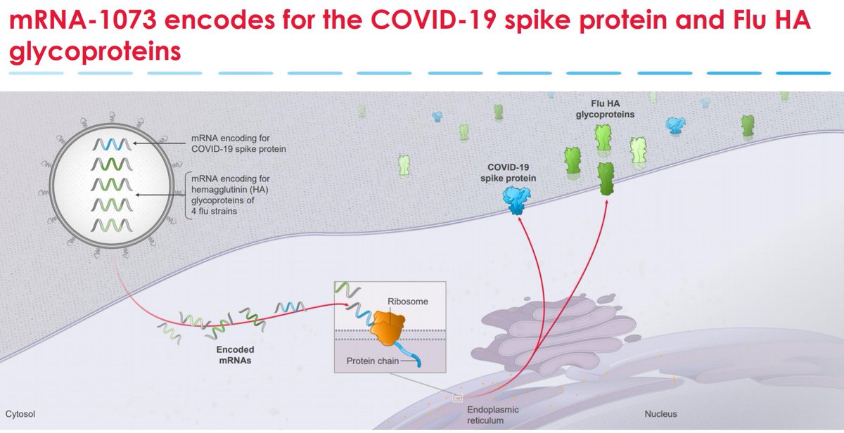 Uma das propostas da Moderna é a vacina contra COVID-19/Gripe. Nela, RNA mensageiros com informações de proteínas da estrutura dos dois vírus são usadas pela célula para produzir e apresentar somente essas proteínas para nosso sistema imunológico, conferindo a proteção para as 2