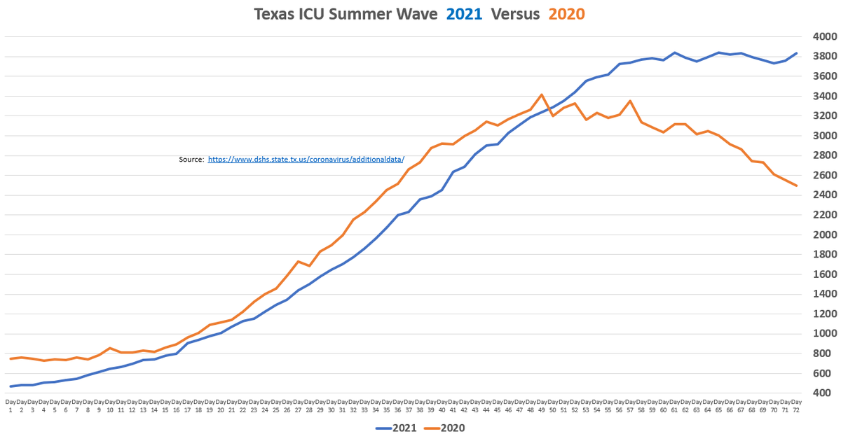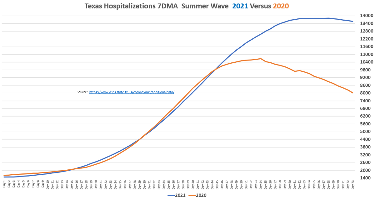 * Despite much higher hosps at this point in the wave, fatalities running ~22% lower than 2020.