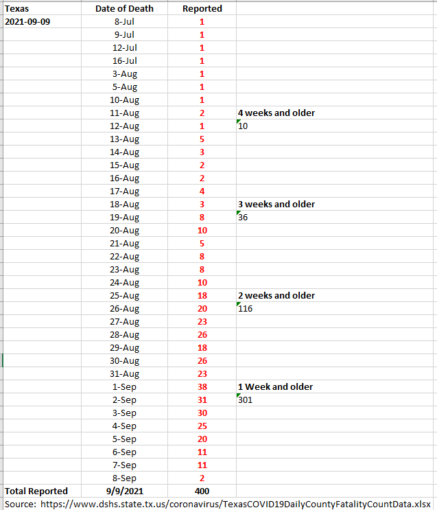 1) Testing definitely peaking last week 2) More Labor Day catch up on Cases 3) Hosps down vs yesterday & Last week. Should decline strongly this weekend 4) Fatality breakdown on 405 reported. Labor Day catch up