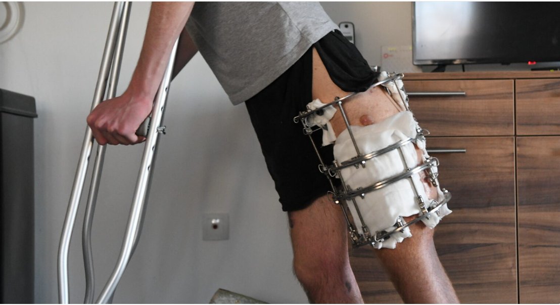 To je specijalno ortopedsko pomagalo, koje u ovom slučaju služi za ekstenziju kosti, kako leva noga ne bi ostala kraća od desne. Inače je visok 187 cm, bio je sportista. Nošenje aparata zahteva poseban dušek sa udubljenjem u odnosu na oblik, pošto još uvek ne može da sedne, nego može samo da leži i pomalo stoji i hoda. I dalje ima jake bolove, jer je povreda njegove leve nadkolenice enormno teška i komplikovana.