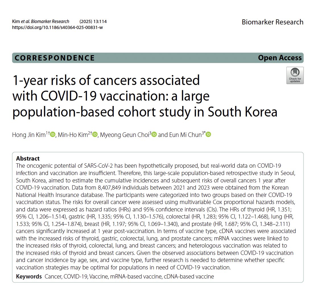A large Korean study just published in Biomarker Research analyzed cancer diagnosis by COVID-19 vaccination status in 1yr following primary or booster doses of vaccines.