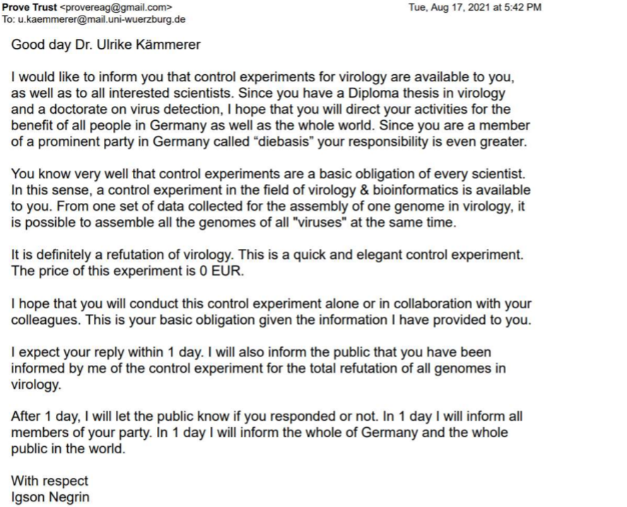 But Kammerer is not that far into the rabbit hole, as is Stefan Lanka. Read here what Negrin writes to her on August 17th. "From one set of data collected for the assembly of one genome in virology it is possible to assemble all the genomes of all 'viruses' at the same time." 6/n
