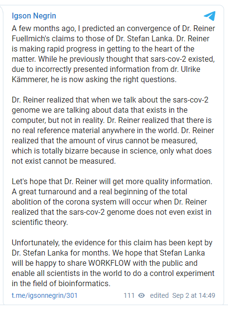 On Telegram Igson Negrin claims that even Reiner Fuellmich is now seeing the "truth" that there is no virus at all, apparently after having interviewed a virus denialist. He urges Stefan Lanka to finally publish the results of his control experiment. 16/n t.me/igsonnegrin/301