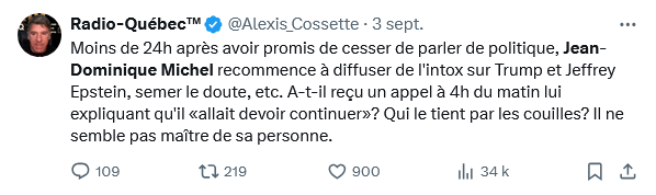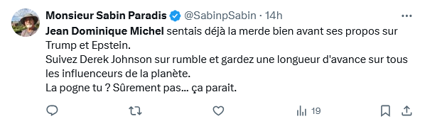 2/n : Mais surtout il est victime des clashes internes à la sphère QAnon. Il s’est fait pourrir par Cossette-Trudel de Radio-Québec, qui lui reproche son antisémitisme, et surtout l’outrecuidance d’avoir lâché Trump sur les Epstein files et après, l’avoir traité de pédophile…