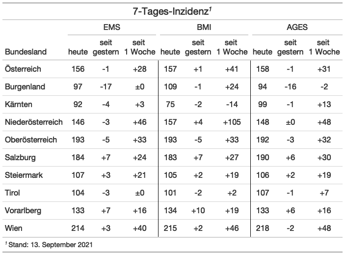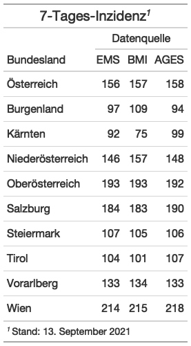 Von gestern, Dienstag 14. September 2021, bis heute, Mittwoch 15. September 2021, gab es - laut EMS-Morgenmeldung - 2447 neuregistrierte positive Fälle. Die Vergleichszahl von gestern war 2009, die Vergleichszahl von vorigem Mittwoch 2559.