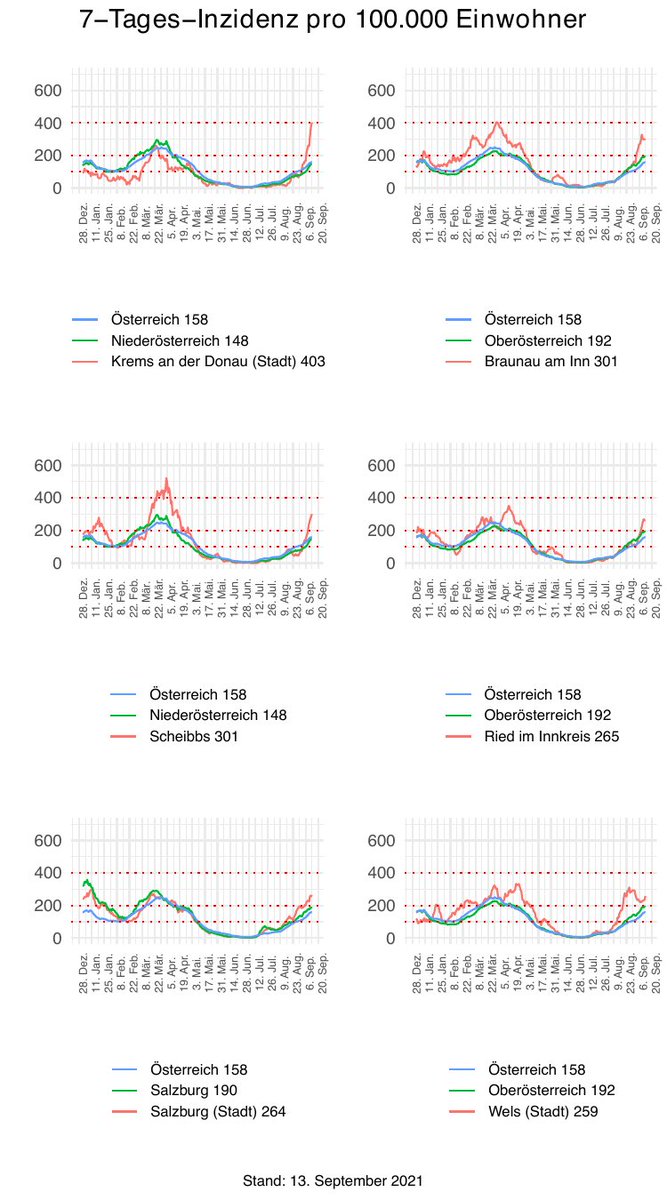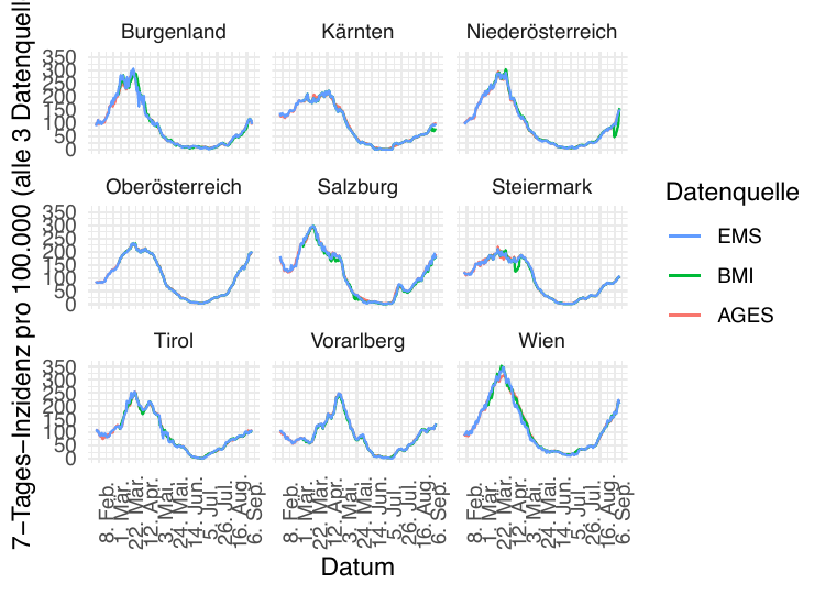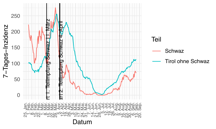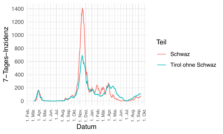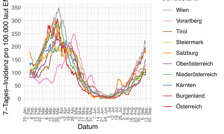Im Folgenden vergleichen wir die Daten so synchronisiert, dass Tag 0 jeweils der Tag mit dem Tiefststand der gesamtösterreichischen Inzidenz ist). Die betreffenden Tage sind der 15. Juni 2020 und der 3. Juli 2021.