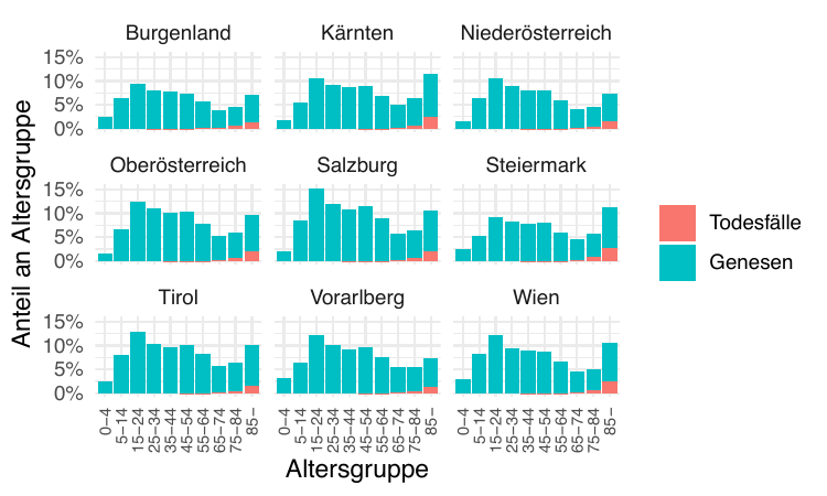 Am 5. Juni wurde die Zählweise der Zahl der Hospitalisierten und der Intensivfälle in Wien umgestellt. Daher weisen die entsprechenden Zeitreihen mit diesem Datum eine Bruchstelle auf.