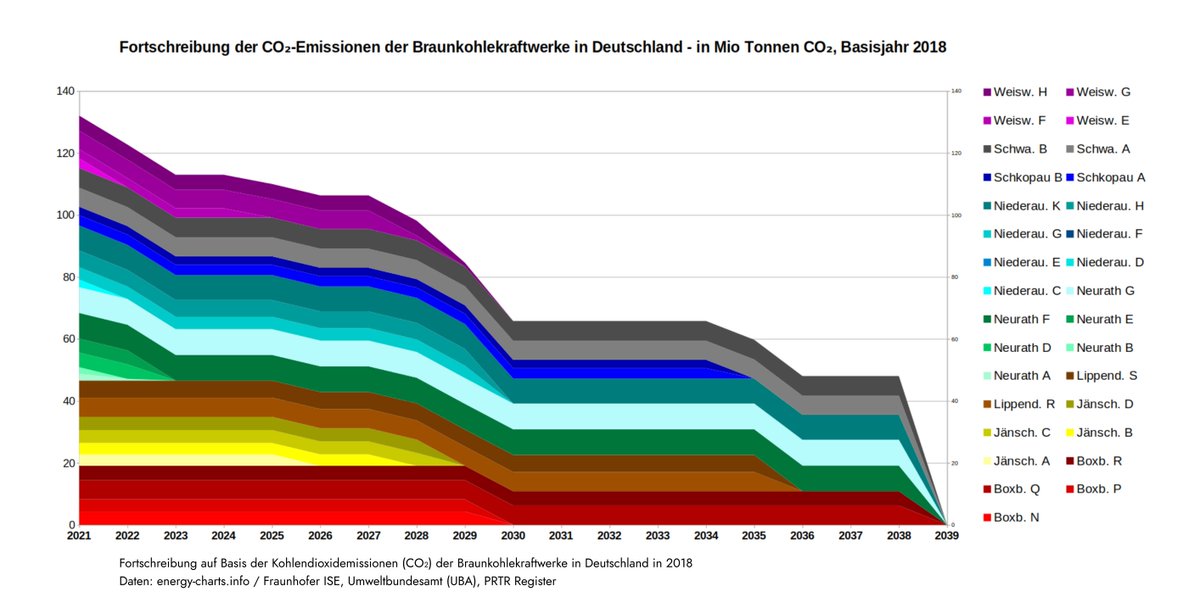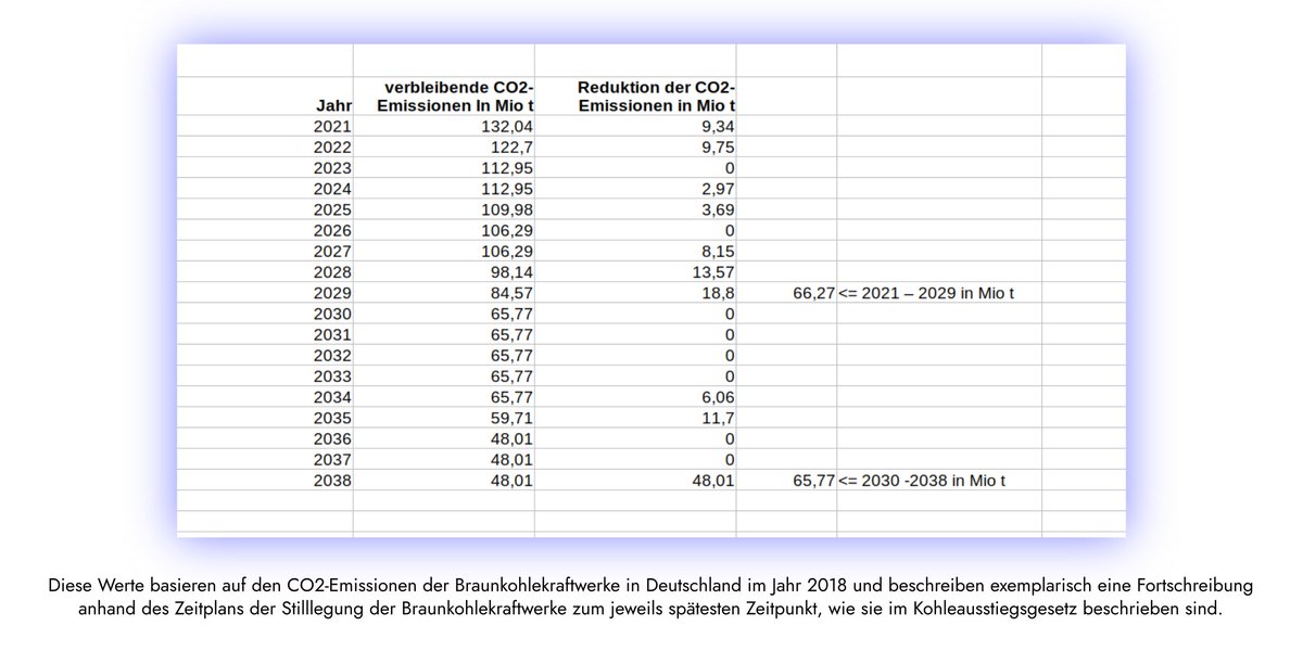 Das ganze noch einmal in Zahlen. Wie im Bild beschrieben, dienen CO2-Emissionszahlen aus dem Jahr 2018 und der Ausstiegspfad laut Kohleausstiegsgesetz als Basis für die exemplarische Fortschreibung der CO2-Emissionen aus einer Braunkohleverstromung bis 2038.
