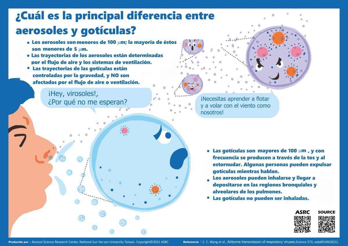 Empieza diferenciando las diferencias entre las gotículas (más grandes) y los virosoles (aerosoles cargados de virus), su origen, su tamaño, estabilidad, movilidad y alcance desde el punto de generación. /3