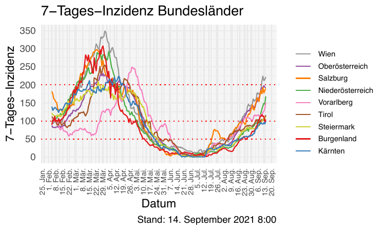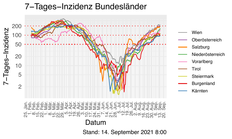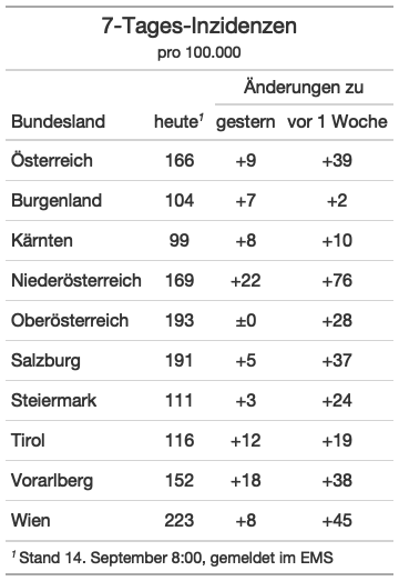 Von gestern, Montag 13. September 2021, bis heute, Dienstag 14. September 2021, gab es - laut EMS-Morgenmeldung - 2009 neuregistrierte positive Fälle. Die Vergleichszahl von gestern war 1310, die Vergleichszahl von vorigem Dienstag 1202.