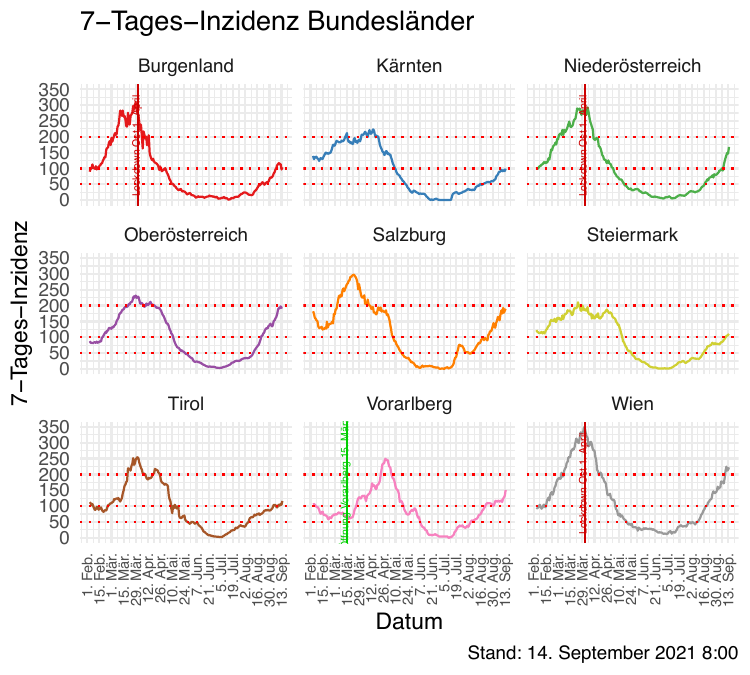 Im Folgenden vergleichen wir die Daten so synchronisiert, dass Tag 0 jeweils der Tag mit dem Tiefststand der gesamtösterreichischen Inzidenz ist). Die betreffenden Tage sind der 15. Juni 2020 und der 3. Juli 2021.