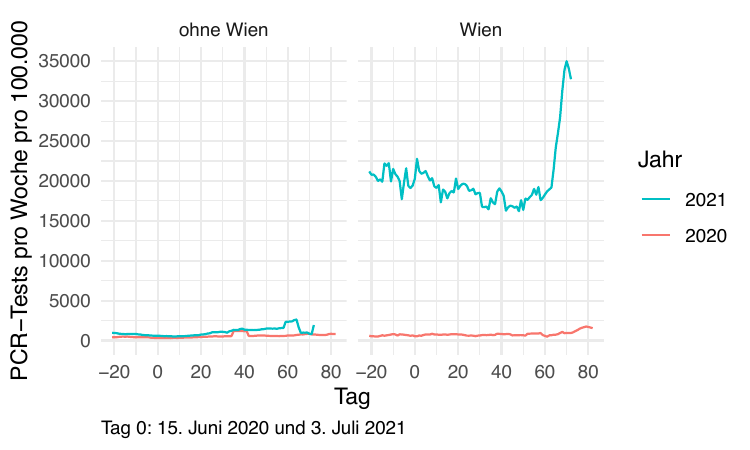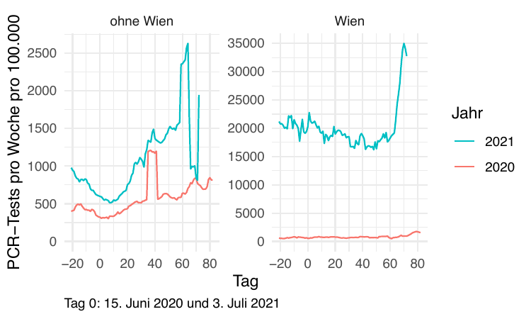 Auf getrennten Skalen sehen wir, dass Wien 2021 fast 40x soviel getestet hat wie 2020.