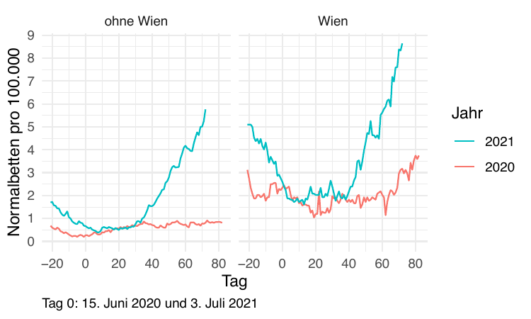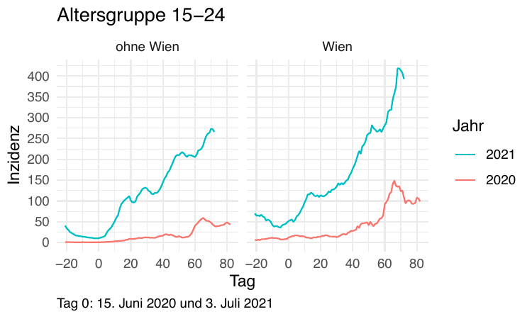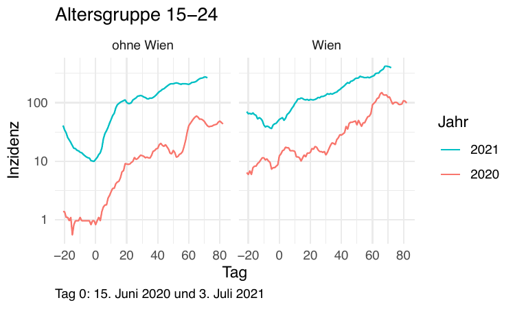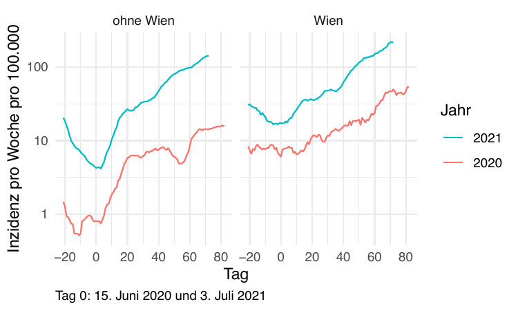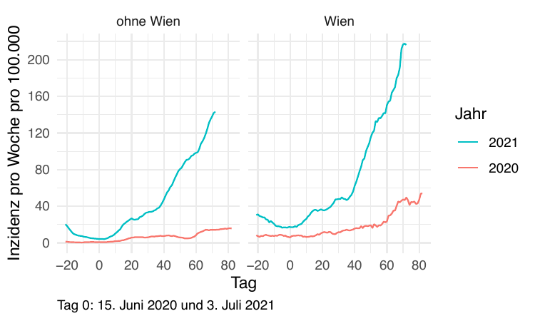 Im Folgenden vergleichen wir die Daten so synchronisiert, dass Tag 0 jeweils der Tag mit dem Tiefststand der gesamtösterreichischen Inzidenz ist). Die betreffenden Tage sind der 15. Juni 2020 und der 3. Juli 2021.