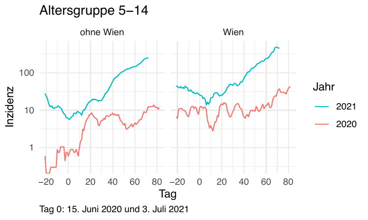 Da der Schulbeginn ins Haus steht, vergleichen wir auch die Inzidenzen der Schüleraltersgruppen im Sommer 2020 und 2021. Zuerst Altersgruppe 5-14 (also grob gesagt VS, MS und AHS-Unterstufe).