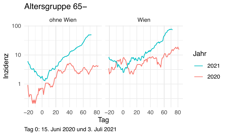 In der Altersgruppe 65+ ist die Inzidenz seit einiger Zeit ein Vielfaches der Werte von vorigem Jahr..
