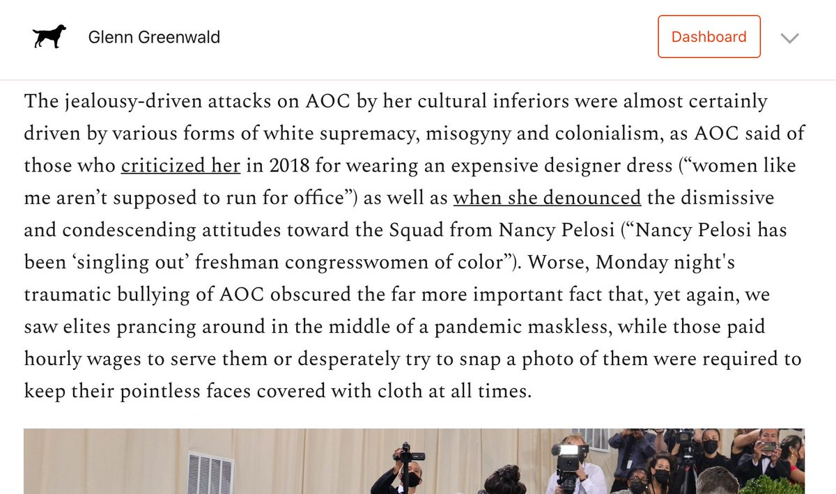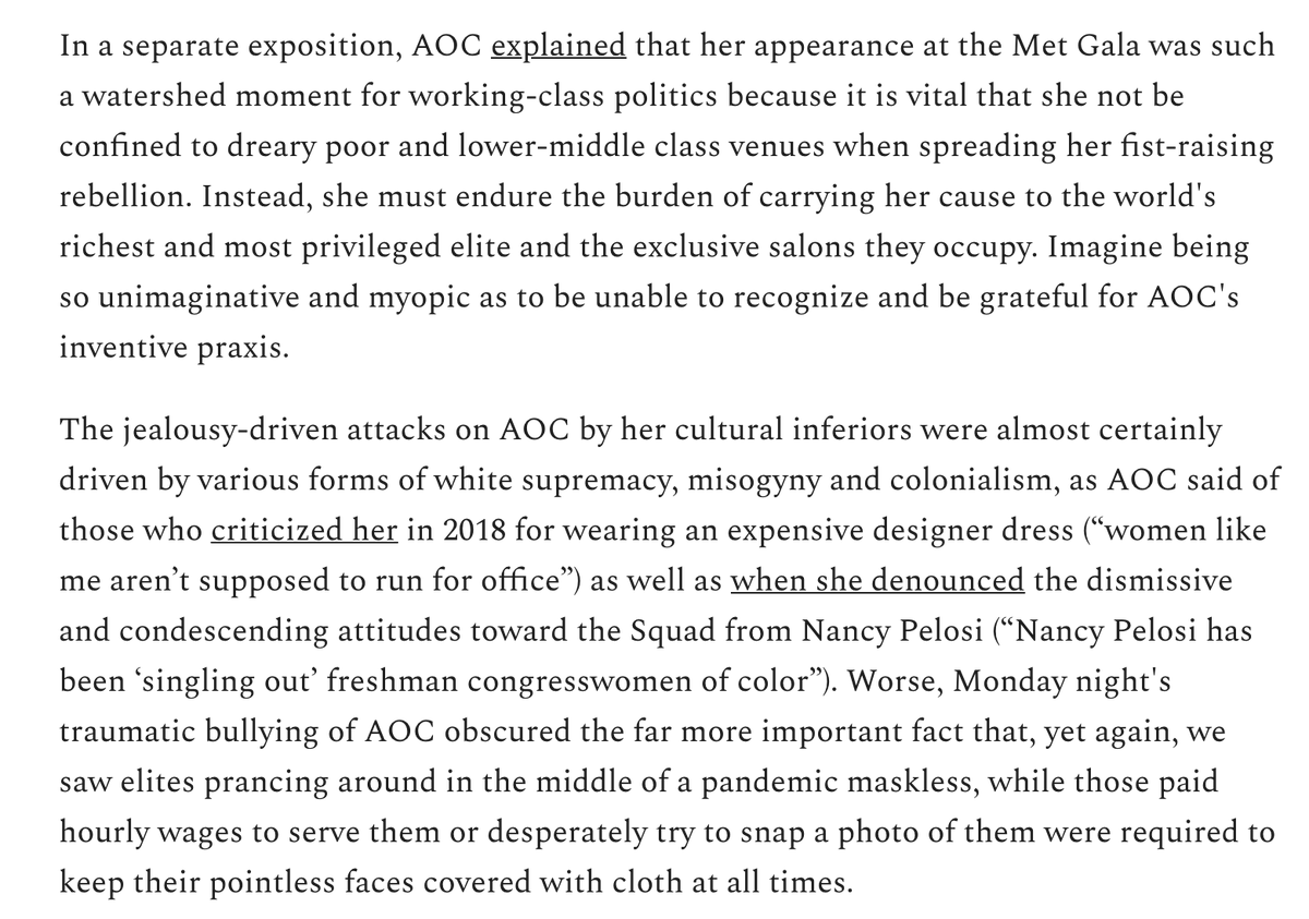 If you find it disturbing that elites go mask-free while their servants are forced to wear cloth over their face as they carry the train of their designer dress, it probably means you are a white supremacist and/or a misogynist, as AOC said earlier.