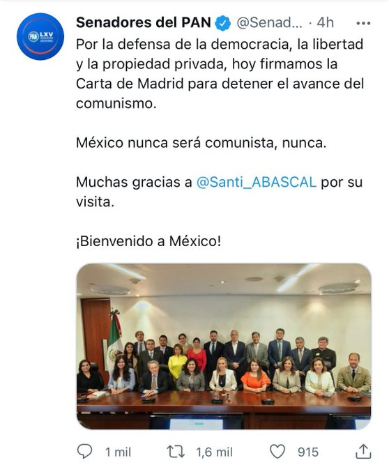 El PAN de México, la cuna de El Yunque, de la que forman parte varios de los senadores que aparecen en la foto, ha tenido que borrar este tuit de la visita de VOX tras el absoluto rechazo. Varios firmaron la Carta de Madrid que lanzaron los principales golpistas de América Latina