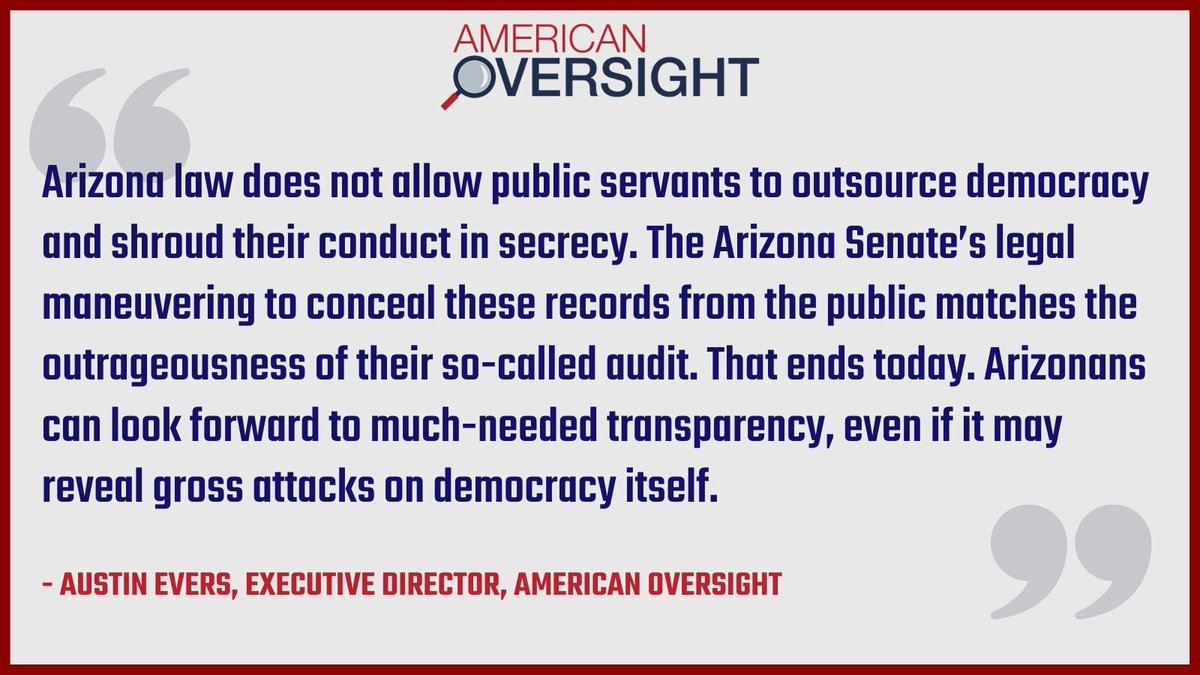 New: The Arizona Senate has now asked Cyber Ninjas to make “audit” records available to the Senate. This follows yesterday’s order from the Arizona Supreme Court that effectively upholds lower court rulings that the documents are public records. americanoversight.org/document/ameri…