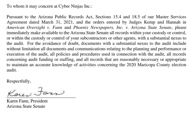 “[P]lease immediately make available to the Arizona State Senate all records within your custody or control...with a substantial nexus to the audit,” Arizona Senate President Karen Fann wrote to the Cyber Ninjas firm yesterday.