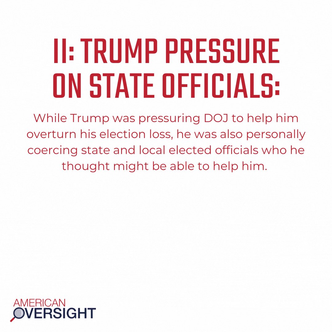 II: Trump Pressure on State Officials. While Trump was pressuring DOJ to help him overturn his election loss, he was also personally coercing state and local elected officials who he thought might be able to help him.