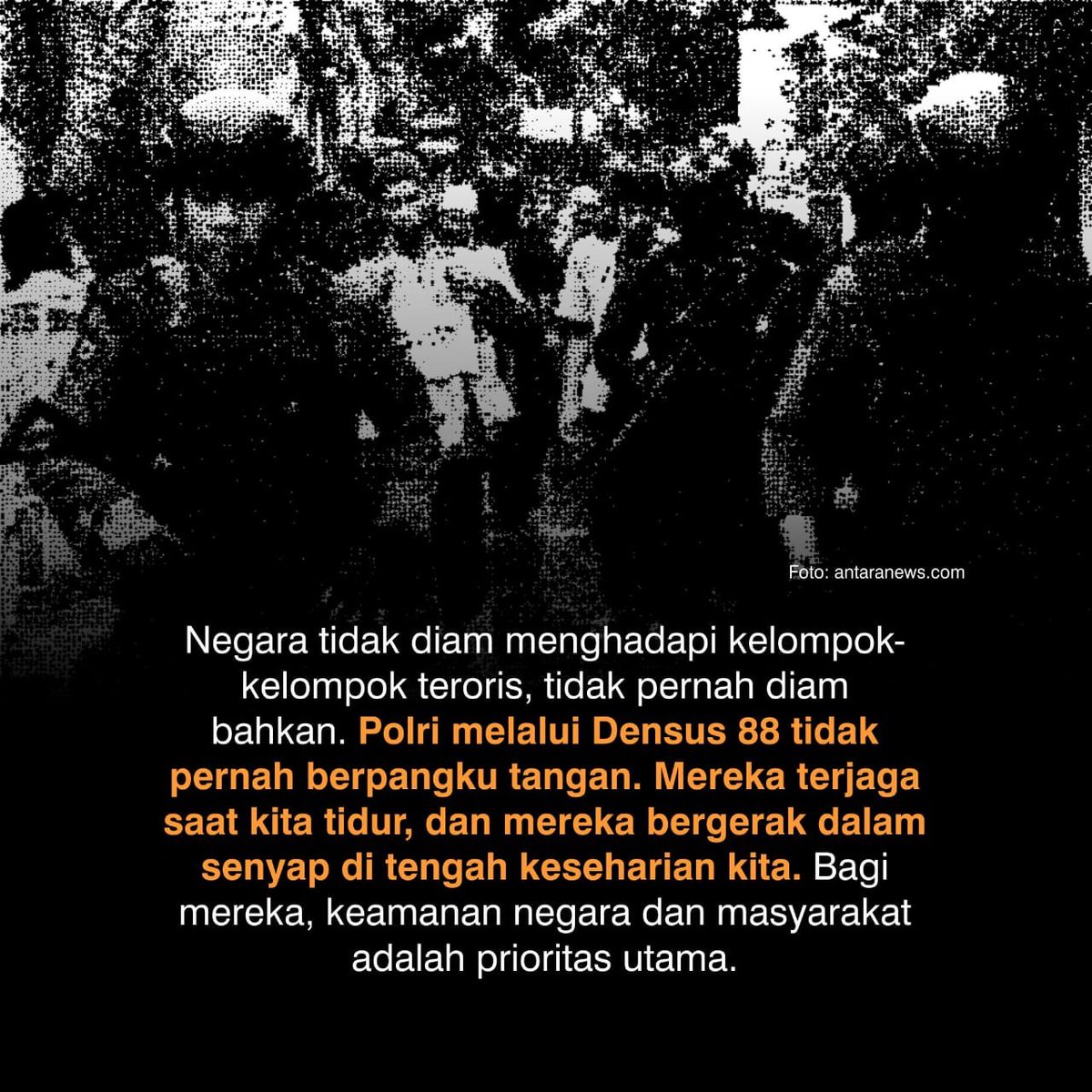 Densus 88 tidak pernah berhenti me lawan terorisme. Bagi Densus yg terpenting adalah menjaga keamanan, ketika kita tidur, mereka bangun. Ketika kita diam, mereka bergerak.