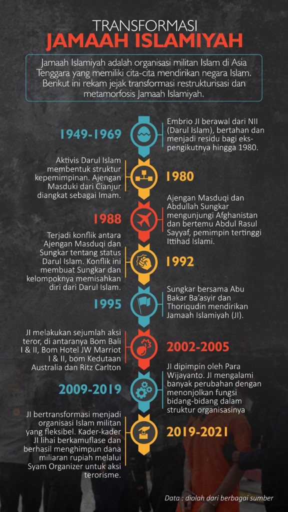 3• Jamaah Islamiyah sendiri merupakan transformasi dr gerakan DI (Darul Islam) yg bertujuan mendirikan NII (Negara Islam Indonesia)