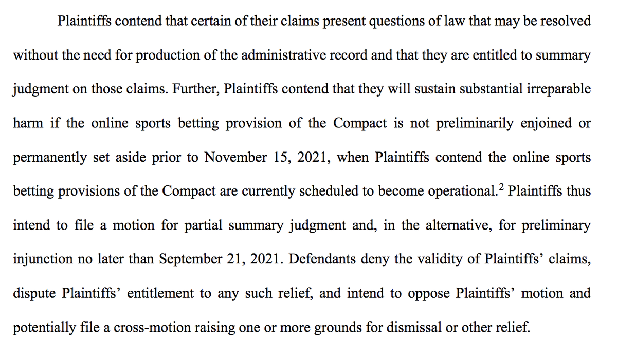 "Further, Plaintiffs contend that they will sustain substantial irreparable harm if the online sports betting provision of the Compact is not preliminarily enjoined or permanently set aside prior to Nov. 15, 2021," when online sports betting is scheduled to become operational.
