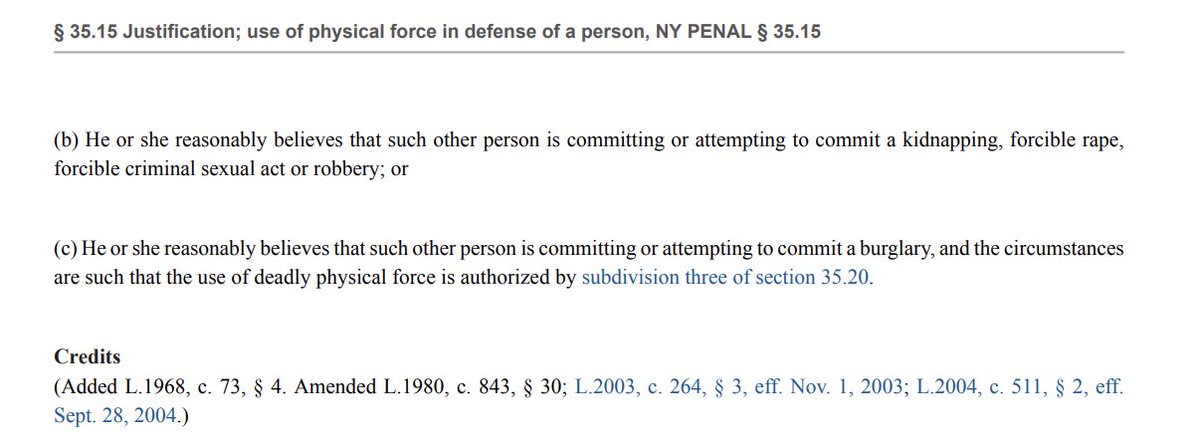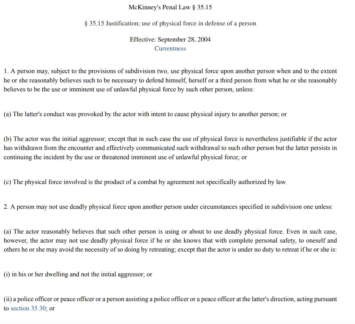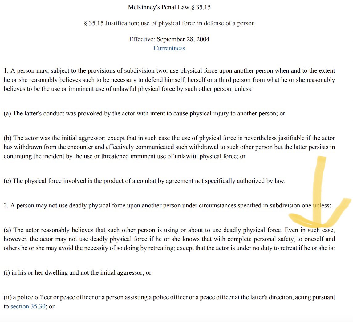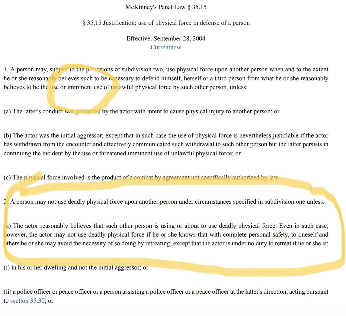 If you believe that a 15-minute long chokehold on the NYC subway (that’s 900 seconds of asphyxiation) is a justified use of deadly force, you really need to read up on NY Penal Law 35.15.👇