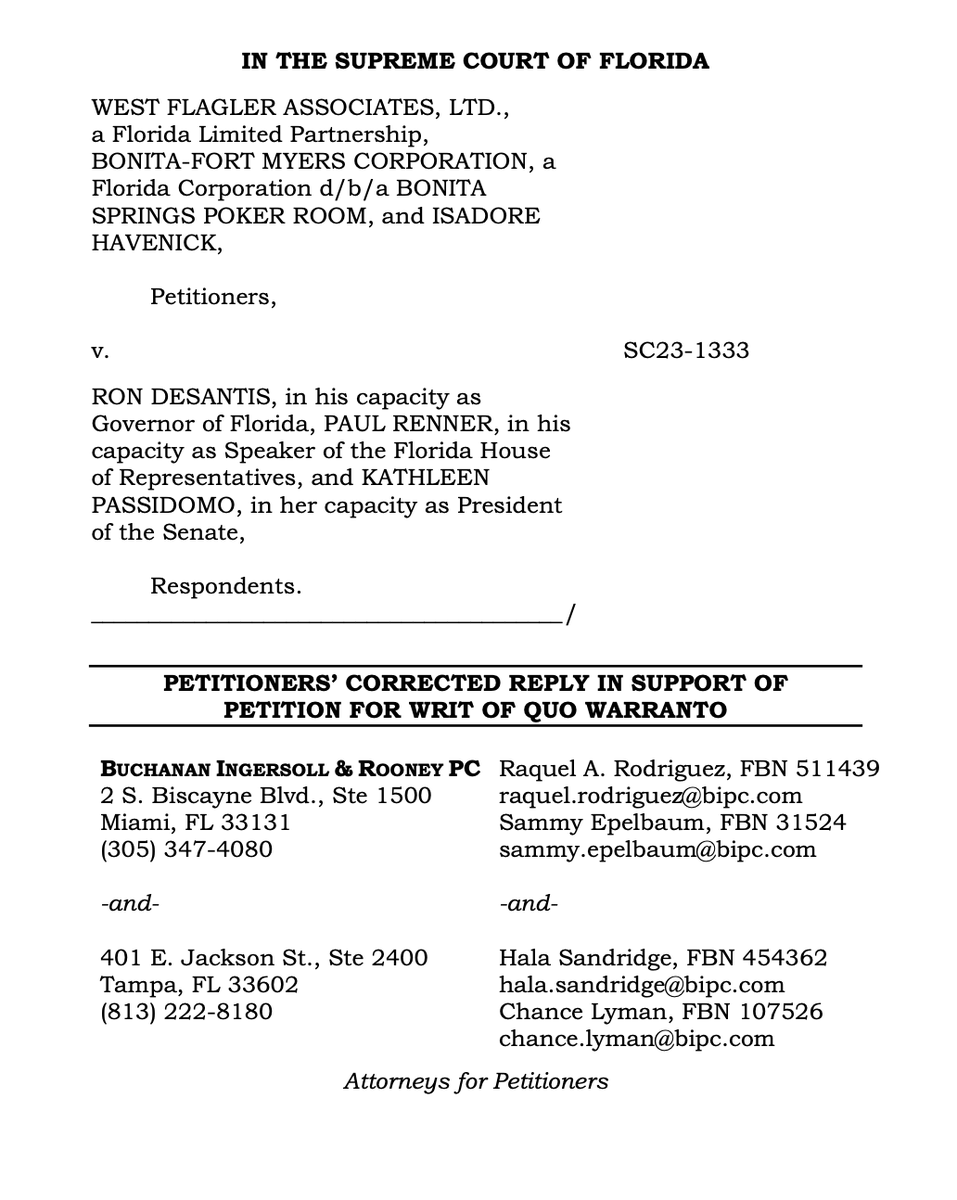 NEW: West Flagler has filed its reply brief in the Florida Supreme Court case challenging the state's online sports betting law on constitutional grounds. The brief highlights admissions made by the proponents of Amendment 3 that "casino gambling" includes sports betting.