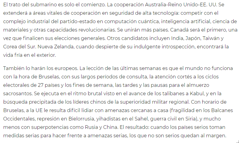 76) En línea con lo que venimos diciendo, esto de @edwardlucas, en donde se afirma con rotundidad que si la #UE no se toma en serio su defensa, la culpa es de la #UE y sus miembros, no de lo que hagan #Australia, #EEUU o el #ReinoUnido.