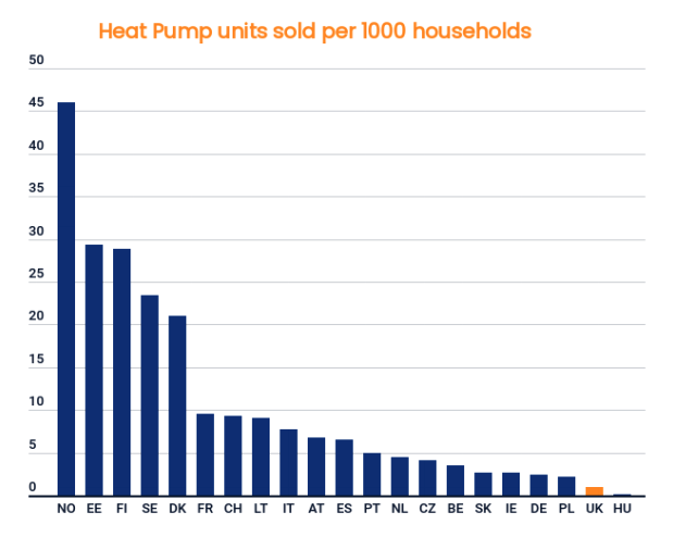 10) In the UK the taxes and levies on gas are particularly low. This results in one of the lowest heat pump installation rates in Europe.