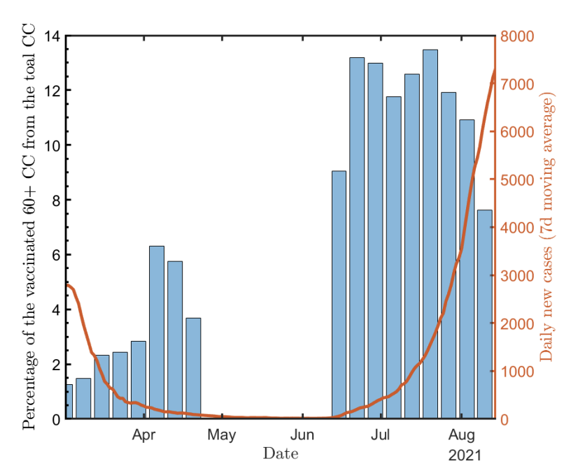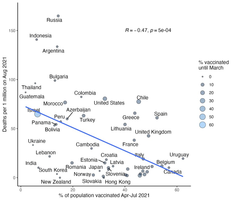 אנחנו חושבים שזה ההסבר. במדינות שאצלן החיסון עדיין טרי הגל הזה חלש משמעותית. אפשר לראות בגרף קשר שלילי חזק בין % המחוסנים מאפריל לבין מספר מקרי המוות מקורונה באוגוסט.