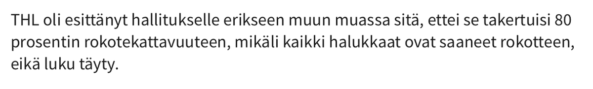 THL:n mukaan pitää varautua rokotuskattavuuden jäämiseen alle 80%, mikä olisi THL:ltä järkyttävä epäonnistuminen. Siihenkö nyt meitä valmistellaan? Tähänkö tyydyttäisiin? 🤯 Nyt pitää valmistella toimet 90%+:n saavuttamiseksi, jos kansan into lopahtaa kesken!