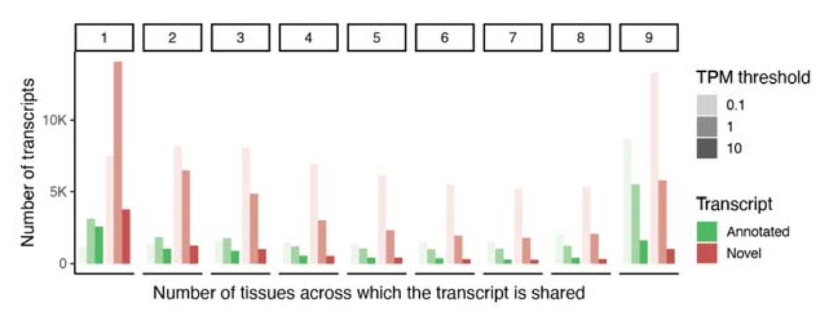 We identified about 100K novel transcripts that validate well in proteome data and are enriched for tissue-specific expression and capture biological signals. This is an important extension of human transcript annotations and shows promise for the future. 3/8
