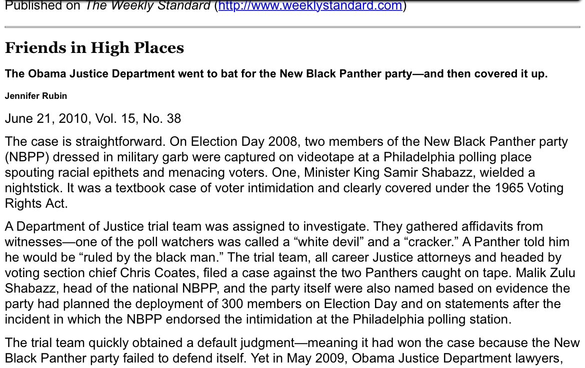 A 2010 weekly standard piece had the hed and subhead: “Friends in High Places: The Obama Justice Department went to bat for the New Black Panther party—and then covered it up”